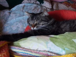 21時過ぎ、タイガーさんが来てカリカリを食べて居ます。帰るのかな?それとも泊まっていくのかな?一旦帰って、10分後に再度現れ、ベッドで寝ています(笑)。