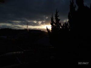 5時40分で雲は多めながら、この東の写真は焦点のマジックです。西南西は明るい陽射しが照らしています。