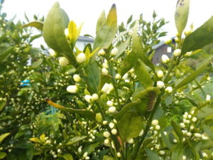 西隣さんの温州ミカンに花が沢山着いていますよ~!白い花がびっしりです。