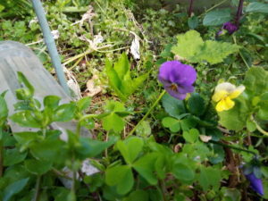 左: 5畝のビオラはクリーム色で始まって、上の2枚の花弁から徐々に紫になり、最後は紫一色になります。