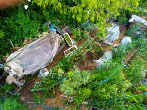 陽が当たる前の庭です。堆肥枠に3株南瓜が見えます。