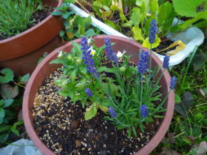 右: ラベンダーです。お隣にある白いパンジーは滅茶滅茶食べられています。美味しいのかなぁ