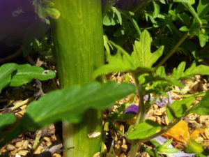 春菊を1本を種取り用に残し後は切りましょう。茂り過ぎて大変な事になって、ミニトマトペペが埋もれています。