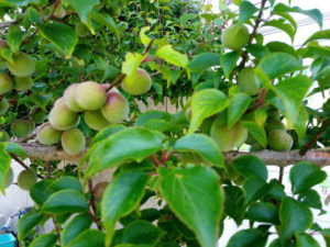 中: 日の当たる枝の梅の実はほんのり赤い。