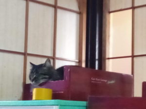 雨の中、うめちゃんはお隣の物置に昼寝に行ったのかな?トラ子と福は家で寝ています。