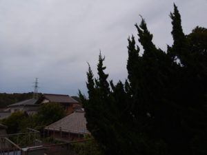 弱い雨が降り出しているみたいです。今は道路が濡れる処までは降っていないけれど、微かな雨の音がします。東北東から東の風が強い時で7m程吹く様です。最低気温はは17度で、このまま変化が1―2度のまま推移して行きます。雨のピークが15時頃で、その前の時間帯に風が若干強く7mとなります。低気圧そのものに吹き込む風ですね。写真は4時45分撮影。