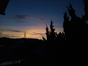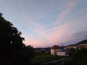 写真は4時27分になって、モノトーンの世界にようやく色が顕れました。”朝焼けは雨”、が正にぴったりの一日の始まりです。モノトーン世界の時は北-北北東から釈の様な雲が見えていましたがばらけましたね。南に釈?正確には南南東です。