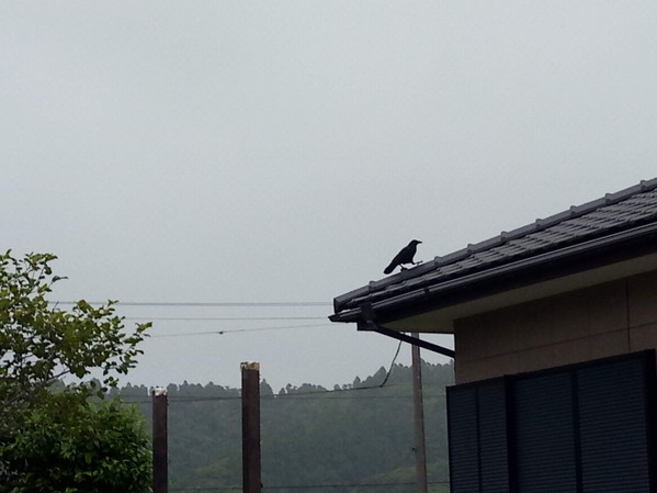 夕方、物干しの向うのお隣の屋根の上に烏が居ました。ガラッと窓を開けると西隣さんの庭から別の烏が飛び立ちました。この烏たちは顔なじみです。我が家の屋根でスキップをする烏だと思いますよ。必ず二羽で行動を共にし、片方が何処かの屋根で司令塔を演じています。危険が差し迫ると”ア”~!!”、と警戒音を出します。ハシボソガラスです。