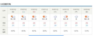 10日間天気予報はまた雨マークが減りました。現在の処、今朝の7時まで小雨、木曜日27日が強雨が一時降るようです。