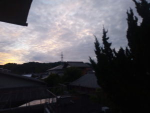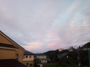 4時24分、西南西の空(右)が急に明るくなってピンクの色が広がり、慌てて東と南の空を取りに行きました。今日はドンヨリ曇り空かなぁ、と一寸残念に思っていただけに嬉しかったですね。東北東に雲があるから北東が一番輝いて居ます。南(中)は一番雲が厚いですね。