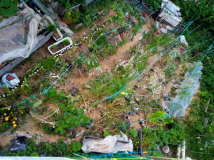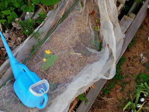 右: 蓬やらドクダミ、その辺に生えている草をプランタ―の表面に入れて見ました。トマトの処には葛を細かく切ってマルチングです。