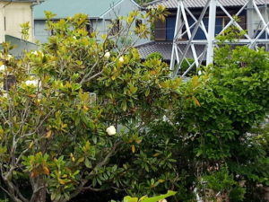 右: 泰山木が咲き出しました。紫つゆ草も紫陽花も咲いています。