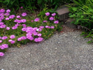 左: 西隣さんのスロープのマツバギクに紋白蝶が留って居ます。
