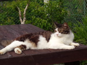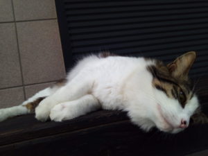 福がいつもの通り、タイガーさんの残りを平らげ、トラ子の手付かずの器を狙っていましたが、間一髪、私が取り上げる事が出来ました。フ~ッ!セーフ。福ちゃん、遣りすぎだよ!トラ子も食事をして出掛けて行きました。さぁ、今度は食べても好いよ。その後、福だけが家で休んでいます。