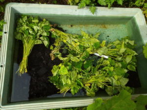 右:セメントの舟でぷかぷか浮いて休んでもらっています。夜は家の中のバケツで休んでもらって、明日植えます。そろそろ根の方にエネルギーが向かう時期ですね。初めての高系14号(五郎島金時)です。10本ずつの束にしては言っていました。随分長い挿し穂ですね。