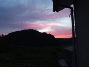 ふと見た西南西が柔らかな茜色に染まっている!西を見れば鮮やかな残照!久し振りだなぁ。何故か、この時期と秋深まった頃に夕焼と残照が綺麗なんですよね。