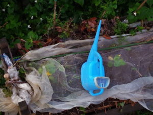 中: 堆肥枠でジョウロの左に在る南瓜に尾花が着きました。