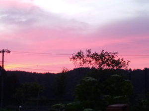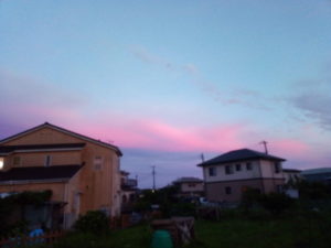 ふと見た西南西が柔らかな茜色に染まっている!西を見れば鮮やかな残照!久し振りだなぁ。何故か、この時期と秋深まった頃に夕焼と残照が綺麗なんですよね。