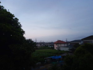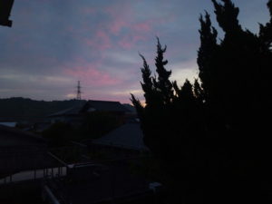 西南西がオレンジ色になって来ました。18時46分が日の入りです。此処では水平線が見えないから30分位早く夕焼になります。残照が見えるかなぁ。残念でした。西-北西側は雲に覆われています。