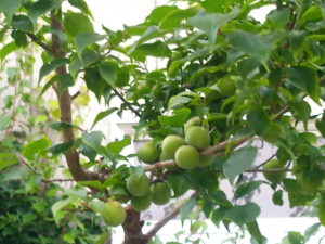 右: なり過ぎている処をシロップか梅酒にするために間引いて行きます。最後はポツンポツンと残して樹上完熟梅干しにします。