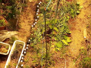 玄関アプローチに3本ずつ挿して、残りは第一畝と二畝に挿しました。お芋は掘り返すので土の構造を壊してしまいます。人にとっては気持ちの良いほろほろした土ですが、植物が根を張るにはあまり好都合ではないらしいです。だから、芋跡の作物の出来は余り良くないそうです。私はそうかなぁ…位の感覚でしかありませんが(笑)。
