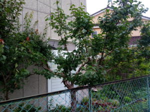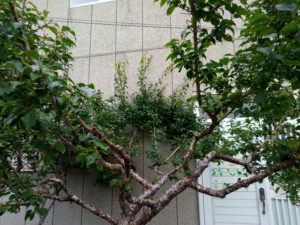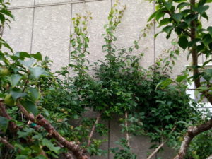 右: 突き当りのヒョロヒョロ伸びた枝は明日切り落としますが、壁に枝がぶつかっているので、少し整理します。今日も大きい枝を2本程処分しました。