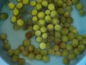 左: これが正に結果です。小さめの果実酒の瓶なら漬け込める量はありますので、梅酒かシロップを作ります。嬉しい事ですが、びっしりと実が生って呉れたので、間引いた分です。小枝に1-2個ずつ残しました。これは樹上完熟に挑戦する実となります。