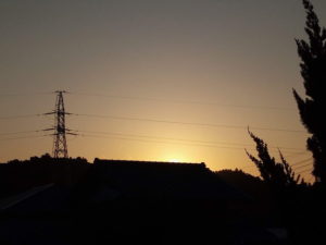 右: フォーカスしたので多少暗めに出ていますが、2軒裏のお家の屋根にもうじき上がってきそうなお天道様の光の環が見えます。