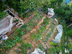 左: 昨日は沢山の草をチョキチョキして畝に置きました。夏は有機物の分解が早いから、しょっちゅう、草刈が必要です。ツユクサの様に少しでも生きていると根を張るものは一旦コンクリートの上で3日位乾燥させてから、畝に置きます。