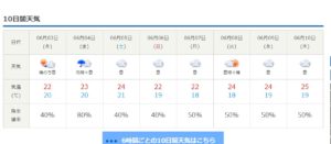 10日間天気予報では、アララ、雨マークは減りましたが、曇りが増えましたね。未だこれは確定には出来ないですね。2―3日分見て行く他はないでしょう。