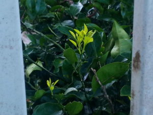 中: 夏蜜柑に二度目の新芽が出て来ました。これが出ると気象庁も発表すると思いますよ。