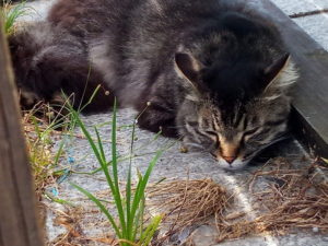 玄関前でチョキチョキしていたらオオヨシキリを咥えたトラ子が来ました。ハンティング出来るだけ行動できるのは有難いけれど、家の中に獲物を持ち込むのは止めてね。