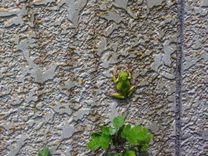 中: この間うめが捕まえて来た蛙かな?また今日も追いかけられていました。壁に掴まって暑そうだったので、上の方の壁に雨水を懸けたら反応していました。