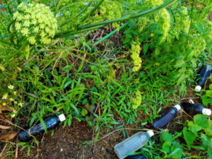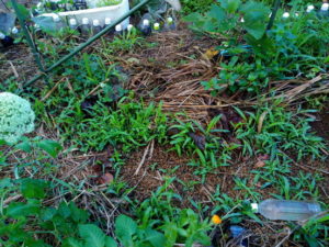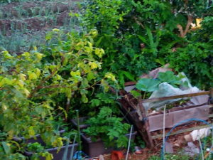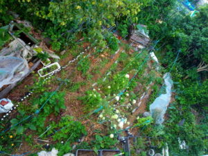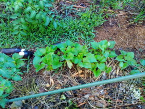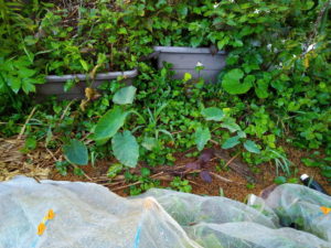 左: 二畝のサツマイモも元気!5月末日植えとは思えない!去年は紅はるかだったけれど、葉が増えなくて心配した…結果もそこそこでした。勿論、畝の使い方に慣れていなかったけれどね。