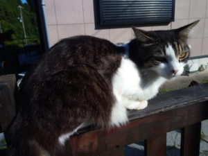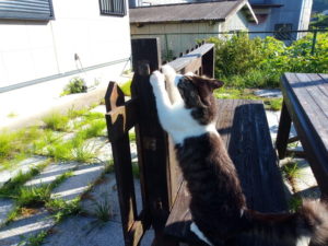 福とうめがやって来ました。福は『お母さん、僕だけかわいがってね』。うめは少し離れた処で控えています。これが猫のルール。ご飯の時も1m後ろで控えています。『うめ、うめちゃん!ご飯食べよう。』、と繰り返して言うとようやく近づいて来ます。二匹と喋っていたら、トラ子も出て来てお隣の青い車の蔭から見ていました(トラ子らしい!)。