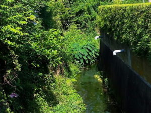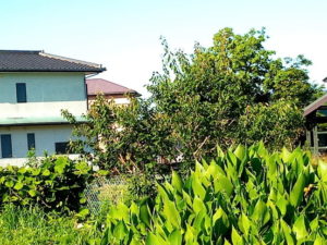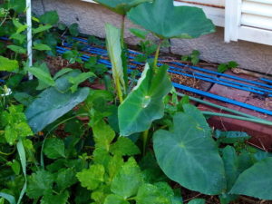 左: I さんの家の横の溝にいつも生える里芋君、今年も凄い株に育っています。