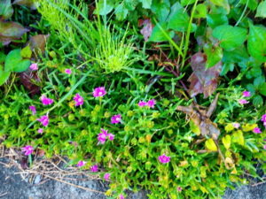 右: 西隣さんの我が家に接した花壇のボーダーはいつの間にか竜の髭は見えなくなり、季節的なものもあるのかも知れませんが、マツバギクが敷石の上に広がっています。