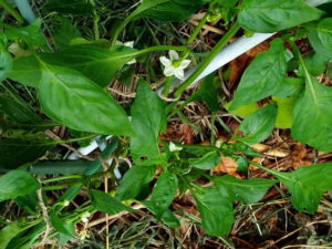 中: 手入れを怠っていたピーマンを盃型に支柱を差して見ました。