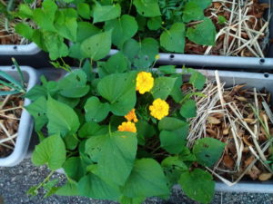 左: ジャガイモと南瓜の蔭から今年もサルビアレウカンサメキシカーナが出て来ました。日当たりを良くしてあげないと、花が着かないかなぁ。南瓜は親蔓の先を切りました。