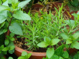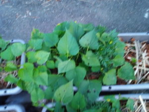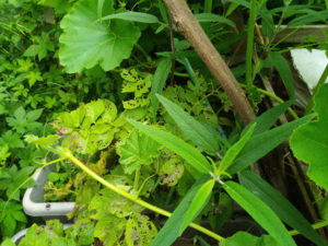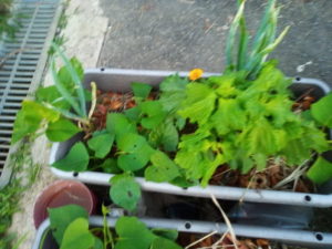 左: ジャガイモと南瓜の蔭から今年もサルビアレウカンサメキシカーナが出て来ました。日当たりを良くしてあげないと、花が着かないかなぁ。南瓜は親蔓の先を切りました。