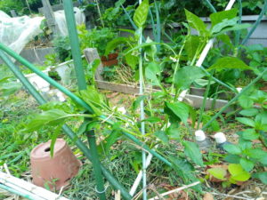 中: 手入れを怠っていたピーマンを盃型に支柱を差して見ました。