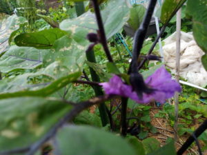 右: 此方は一番生長の茄子。支柱を差して麻紐で止めたら4本仕立てに!?