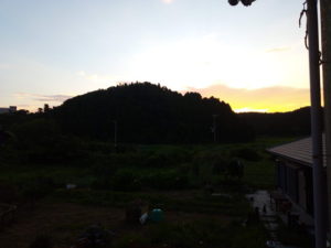 左: 夕焼が始まりました。今日の日の入りは18時58分。