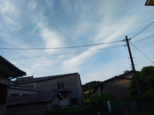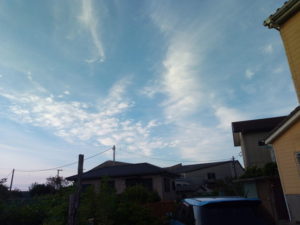 今日は曇りで時々薄日が差す天気でしたが、夕方近くなって急に青空が広がりました。やはり青空は人を動かしますね。青空を見ると洗濯ものを干したくなります。猫は表に行ってゴロン!、植物は蓄えた水分・養分で思い切り伸びようとします。種は違っても、同じですね。