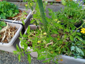 これは昨夕撮った写真ですが、グルグル巻きを命じられたトマトたちは、昨日の朝には支柱の向う側に生長点の枝がありました。夕方には楽勝で支柱を外側から巻いて左巻きに回る事が出来ました。今朝はもっと楽に回っています。余り無理をさせない様に少しずつ回して行きます。
