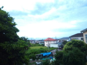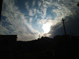 左: 物干しから見たら、西の山の向うへ沈む太陽がまぶしかったので、表に行きました。
