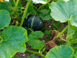 右: 南瓜の実が大きくなりました。お隣の小父ちゃんは『一株に5個も付いて大きくなるかなぁ。』、と贅沢な心配をしていました(笑)。