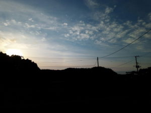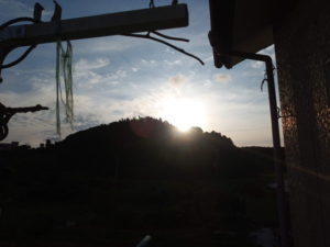 左: 物干しから見たら、西の山の向うへ沈む太陽がまぶしかったので、表に行きました。