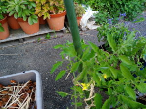 これは昨夕撮った写真ですが、グルグル巻きを命じられたトマトたちは、昨日の朝には支柱の向う側に生長点の枝がありました。夕方には楽勝で支柱を外側から巻いて左巻きに回る事が出来ました。今朝はもっと楽に回っています。余り無理をさせない様に少しずつ回して行きます。