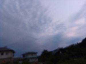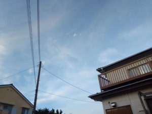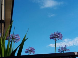 今日は曇りで時々薄日が差す天気でしたが、夕方近くなって急に青空が広がりました。やはり青空は人を動かしますね。青空を見ると洗濯ものを干したくなります。猫は表に行ってゴロン!、植物は蓄えた水分・養分で思い切り伸びようとします。種は違っても、同じですね。